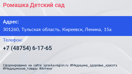 Ромашка, Детский сад по адресу 301260, Тульская область, Киреевск, Ленина, 15а в дальнейшем Организация, размещена в следующих категориях: