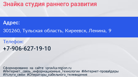 Знайка, студия раннего развития по адресу 301260, Тульская область, Киреевск, Ленина, 9 в дальнейшем Организация, размещена в следующих категориях: