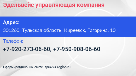 Эдельвейс, управляющая компания по адресу 301260, Тульская область, Киреевск, Гагарина, 10 в дальнейшем Организация, размещена в следующих категориях: