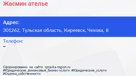 Жасмин, ателье по адресу 301262, Тульская область, Киреевск, Чехова, 8 в дальнейшем Организация, размещена в следующих категориях: