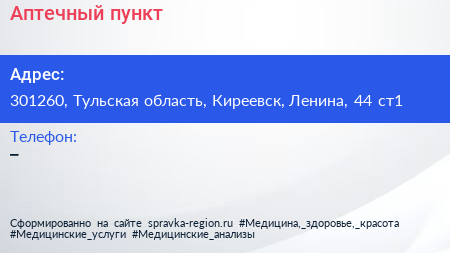 Аптечный пункт по адресу 301260, Тульская область, Киреевск, Ленина, 44 ст1 в дальнейшем Организация, размещена в следующих категориях: