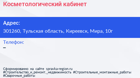Косметологический кабинет по адресу 301260, Тульская область, Киреевск, Мира, 10г в дальнейшем Организация, размещена в следующих категориях: