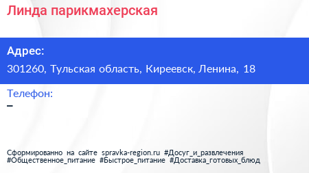 Линда, парикмахерская по адресу 301260, Тульская область, Киреевск, Ленина, 18 в дальнейшем Организация, размещена в следующих категориях: