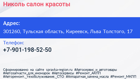 Николь, салон красоты по адресу 301260, Тульская область, Киреевск, Льва Толстого, 17 в дальнейшем Организация, размещена в следующих категориях: