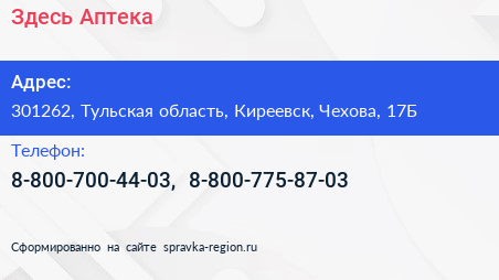 Здесь Аптека по адресу 301262, Тульская область, Киреевск, Чехова, 17Б в дальнейшем Организация, размещена в следующих категориях: