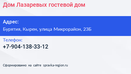 Дом Лазаревых, гостевой дом по адресу Бурятия, Кырен, улица Микрорайон, 23Б в дальнейшем Организация, размещена в следующих категориях: