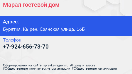 Марал, гостевой дом по адресу Бурятия, Кырен, Саянская улица, 16Б в дальнейшем Организация, размещена в следующих категориях: