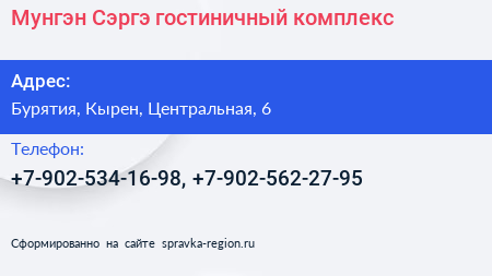 Мунгэн Сэргэ, гостиничный комплекс по адресу Бурятия, Кырен, Центральная, 6 в дальнейшем Организация, размещена в следующих категориях:
