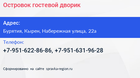 Островок, гостевой дворик по адресу Бурятия, Кырен, Набережная улица, 22а в дальнейшем Организация, размещена в следующих категориях: