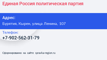 Единая Россия, политическая партия по адресу Бурятия, Кырен, улица Ленина, 107 в дальнейшем Организация, размещена в следующих категориях:
