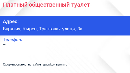 Платный общественный туалет по адресу Бурятия, Кырен, Трактовая улица, 3а в дальнейшем Организация, размещена в следующих категориях: