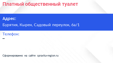 Платный общественный туалет по адресу Бурятия, Кырен, Садовый переулок, 6а/1 в дальнейшем Организация, размещена в следующих категориях: