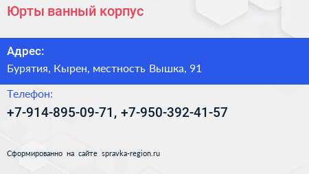 Юрты, ванный корпус по адресу Бурятия, Кырен, местность Вышка, 91 в дальнейшем Организация, размещена в следующих категориях: