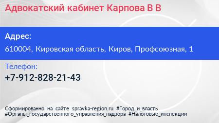 Адвокатский кабинет Карпова В.В. по адресу 610004, Кировская область, Киров, Профсоюзная, 1 в дальнейшем Организация, размещена в следующих категориях: