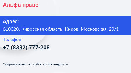 Альфа право по адресу 610020, Кировская область, Киров, Московская, 29/1 в дальнейшем Организация, размещена в следующих категориях: