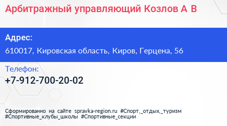 Арбитражный управляющий Козлов А.В. по адресу 610017, Кировская область, Киров, Герцена, 56 в дальнейшем Организация, размещена в следующих категориях: