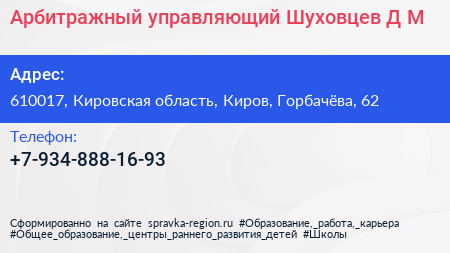 Арбитражный управляющий Шуховцев Д.М. по адресу 610017, Кировская область, Киров, Горбачёва, 62 в дальнейшем Организация, размещена в следующих категориях: