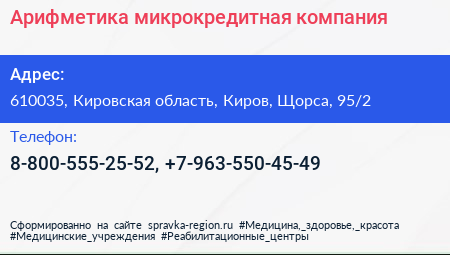 Арифметика, микрокредитная компания по адресу 610035, Кировская область, Киров, Щорса, 95/2 в дальнейшем Организация, размещена в следующих категориях: