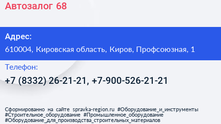 Автозалог 68 по адресу 610004, Кировская область, Киров, Профсоюзная, 1 в дальнейшем Организация, размещена в следующих категориях: