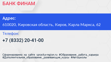БАНК ФИНАМ по адресу 610020, Кировская область, Киров, Карла Маркса, 62 в дальнейшем Организация, размещена в следующих категориях: