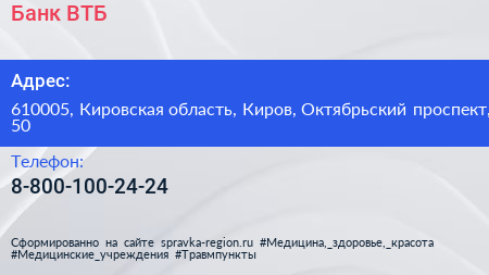 Банк ВТБ по адресу 610005, Кировская область, Киров, Октябрьский проспект, 50 в дальнейшем Организация, размещена в следующих категориях: