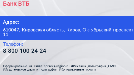 Банк ВТБ по адресу 610047, Кировская область, Киров, Октябрьский проспект, 11 в дальнейшем Организация, размещена в следующих категориях:
