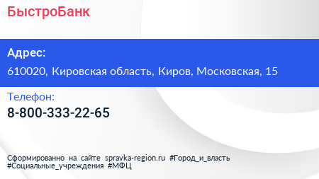БыстроБанк по адресу 610020, Кировская область, Киров, Московская, 15 в дальнейшем Организация, размещена в следующих категориях: