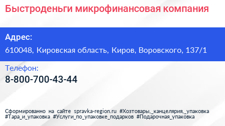 Быстроденьги, микрофинансовая компания по адресу 610048, Кировская область, Киров, Воровского, 137/1 в дальнейшем Организация, размещена в следующих категориях: