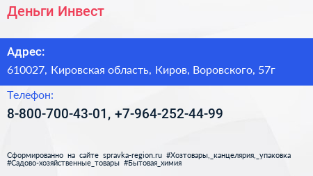 Деньги Инвест по адресу 610027, Кировская область, Киров, Воровского, 57г в дальнейшем Организация, размещена в следующих категориях: