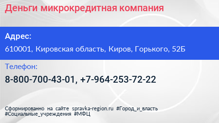 Деньги!, микрокредитная компания по адресу 610001, Кировская область, Киров, Горького, 52Б в дальнейшем Организация, размещена в следующих категориях:
