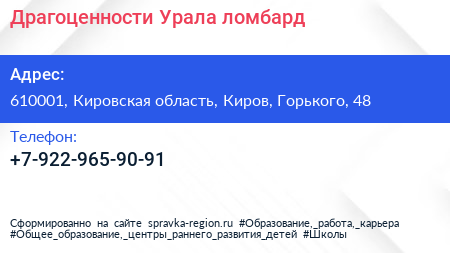 Драгоценности Урала, ломбард по адресу 610001, Кировская область, Киров, Горького, 48 в дальнейшем Организация, размещена в следующих категориях: