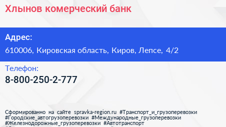 Хлынов, комерческий банк по адресу 610006, Кировская область, Киров, Лепсе, 4/2 в дальнейшем Организация, размещена в следующих категориях: