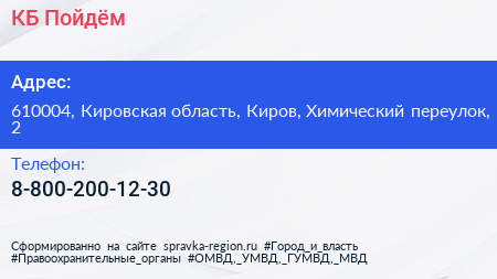 КБ Пойдём! по адресу 610004, Кировская область, Киров, Химический переулок, 2 в дальнейшем Организация, размещена в следующих категориях: