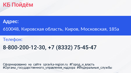 КБ Пойдём! по адресу 610048, Кировская область, Киров, Московская, 185а в дальнейшем Организация, размещена в следующих категориях: