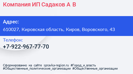 Компания, ИП Садаков А.В. по адресу 610027, Кировская область, Киров, Воровского, 43 в дальнейшем Организация, размещена в следующих категориях: