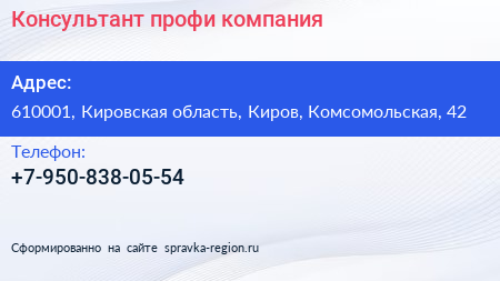 Консультант-профи, компания по адресу 610001, Кировская область, Киров, Комсомольская, 42 в дальнейшем Организация, размещена в следующих категориях: