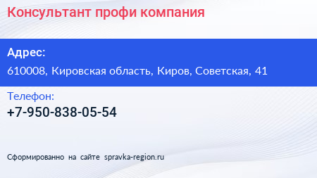 Консультант-профи, компания по адресу 610008, Кировская область, Киров, Советская, 41 в дальнейшем Организация, размещена в следующих категориях: