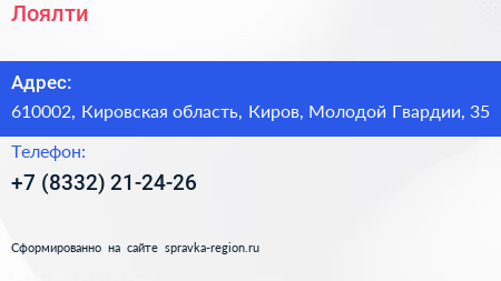 Лоялти по адресу 610002, Кировская область, Киров, Молодой Гвардии, 35 в дальнейшем Организация, размещена в следующих категориях: