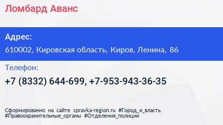 Ломбард Аванс по адресу 610002, Кировская область, Киров, Ленина, 86 в дальнейшем Организация, размещена в следующих категориях: