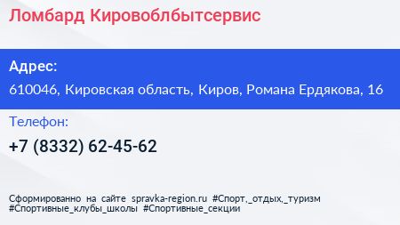 Ломбард Кировоблбытсервис по адресу 610046, Кировская область, Киров, Романа Ердякова, 16 в дальнейшем Организация, размещена в следующих категориях: