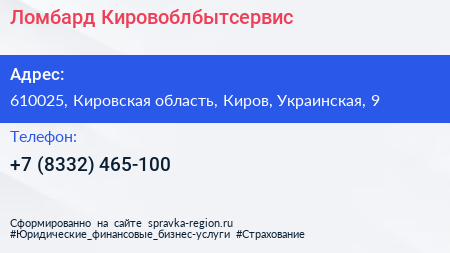 Ломбард Кировоблбытсервис по адресу 610025, Кировская область, Киров, Украинская, 9 в дальнейшем Организация, размещена в следующих категориях: