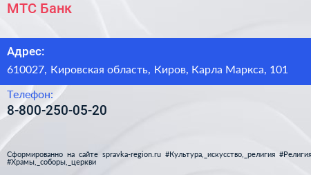 МТС-Банк по адресу 610027, Кировская область, Киров, Карла Маркса, 101 в дальнейшем Организация, размещена в следующих категориях: