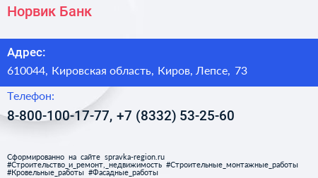 Норвик Банк по адресу 610044, Кировская область, Киров, Лепсе, 73 в дальнейшем Организация, размещена в следующих категориях: