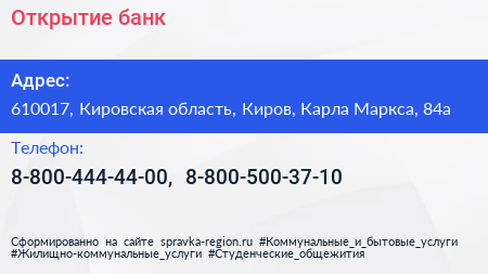 Открытие, банк по адресу 610017, Кировская область, Киров, Карла Маркса, 84а в дальнейшем Организация, размещена в следующих категориях:
