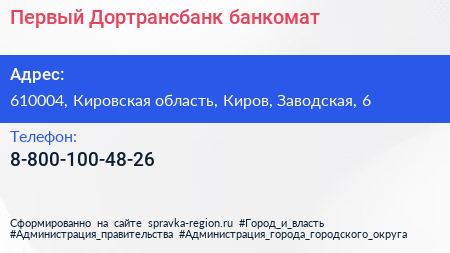 Первый Дортрансбанк, банкомат по адресу 610004, Кировская область, Киров, Заводская, 6 в дальнейшем Организация, размещена в следующих категориях: