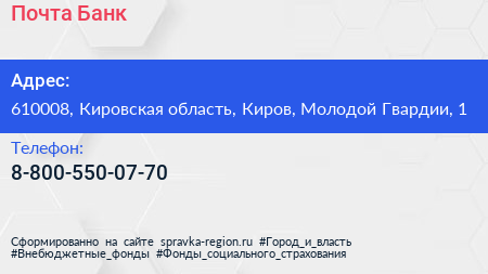 Почта Банк по адресу 610008, Кировская область, Киров, Молодой Гвардии, 1 в дальнейшем Организация, размещена в следующих категориях: