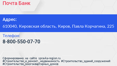 Почта Банк по адресу 610040, Кировская область, Киров, Павла Корчагина, 225 в дальнейшем Организация, размещена в следующих категориях: