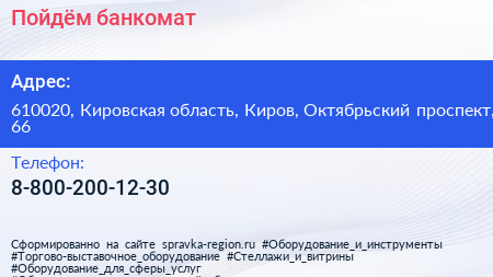 Пойдём!, банкомат по адресу 610020, Кировская область, Киров, Октябрьский проспект, 66 в дальнейшем Организация, размещена в следующих категориях: