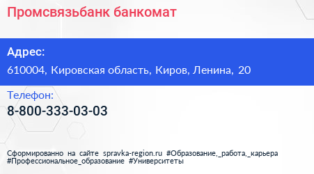 Промсвязьбанк, банкомат по адресу 610004, Кировская область, Киров, Ленина, 20 в дальнейшем Организация, размещена в следующих категориях: