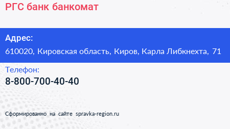 РГС банк, банкомат по адресу 610020, Кировская область, Киров, Карла Либкнехта, 71 в дальнейшем Организация, размещена в следующих категориях: